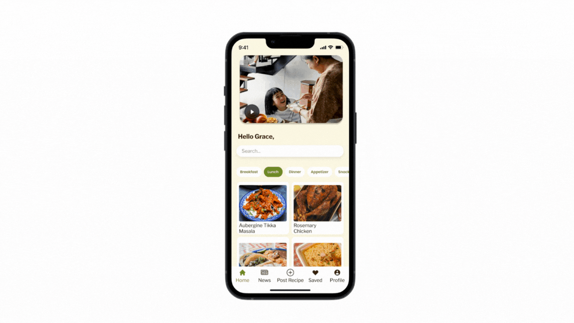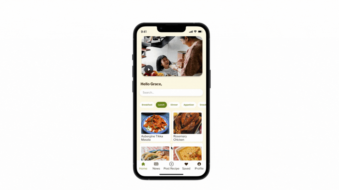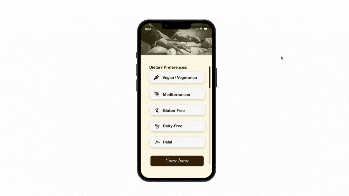 The original concept factored in a meal planning aspect to the offered features, yet diminished from the main goal of our product design, which is to create a cultural connection via recipes. Considering that, we pivoted to focus on features that bolstered the passion and emphasis on connection and creating a solution for a user base that skewed older. This entails a straightforward task flow that causes minimal friction, requiring minimal actions to achieve end goals and plenty of elements to guide the user for an efficient process.